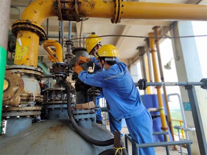 。图为氯化苄装置人员和检修人员为氯化反应釜气相管增加
