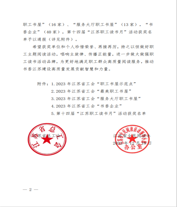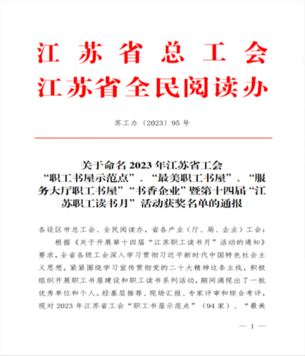 近日,公司职工书屋被江苏省总工会、江苏省全民阅读办命名为2023年江苏省工会“职工书屋示范点”。