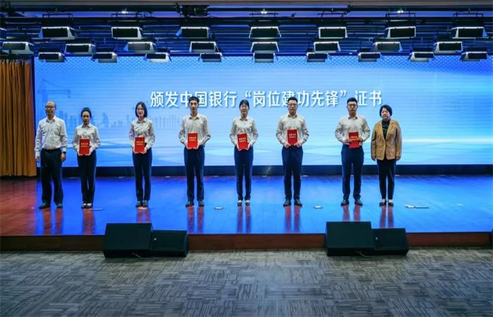 市民政局副局长钟玲,中国银行连云港分行党委委员、纪委书记黄振秦为中国银行系统“岗位建功先锋”颁奖。