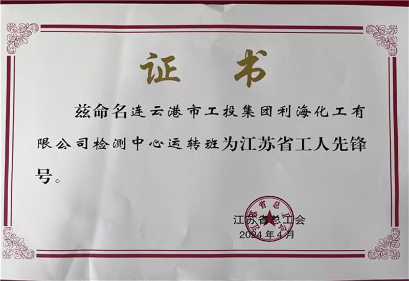 近日,公司检测中心运转班荣获江苏省总工会“工人先锋号”称号。